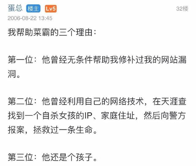 没过多久,菜霸被湖北天门市网监大队抓获。但这样行为出格、干过不少“坏事”的少年,在很多人眼中,是一个行侠仗义的网络“英雄”。就在腾讯事件的3个月前,菜霸还挽救了一名花季少女的生命。2006年5月12日下午,一个重庆女孩在天涯上发帖,似乎是要服用安眠药结束自己的生命。