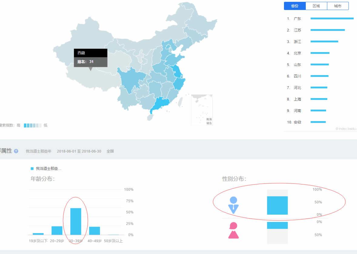 这个图是 “我当道士那些年”的数据分析,可以看到男人比女人用户多,30—39岁的观看者众多。这些人现在都在哪儿?