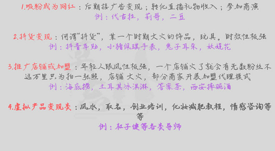 以上四种变现方式,对于我们草根创业者来说,既没有极其出众的容貌歌声或者幽默诙谐的风格,也没有背后推手团队的大力支持,成为网红这条路极为艰难,因此我并不是特别推荐走这条路,太难。