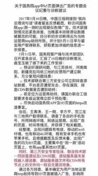 但是,因为512的WanaCrypt0r 2.0比特币勒索病毒,这一轰动全球的事件,转移了大家的视线,而这一更大爆点的网络信息安全事件却鲜为人知,或者说关注的人比较少。 该App某H5页面被植入色情内容广告,后经排查“基本确定为用户当地运营商http劫持导致H5页面被插入广告......”