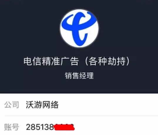 根据沃媒网提供的客服联系方式,我们与沃媒网工作人员取得了联系。值得一提的是,这名客服人员的头像为中国电信Logo,且在昵称中明文写有“各种劫持”!