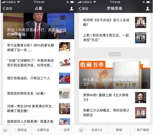 时政分析类账号『占豪』,以其辛辣的时政点评受用户追捧;『刘备我祖』以其文言文写作风格吸引一众粉丝;罗振宇的『罗辑思维』坚持了2000多天的每日60S语音推送,形成其特色文化标签;『新世相』策划了“逃离北上广”、“中秋回家系列”、“1小时偶像剧女主角”、“丢书大作战”等一些列刷屏活动。
