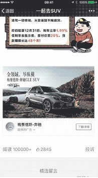 2016年10月20日,在“有车以后”、“一条”、“微信路况”、“占豪”、“一起去SUV”等公众号推送的图文底部,出现了同一条梅赛德斯奔驰的广告。这是全国第一个公众号Banner硬广,点击大图banner可直接跳转到广告页面。