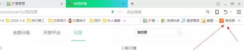 接着,会出现360应用市场,在下图箭头处搜索“淘货源”,插件就会出现了: