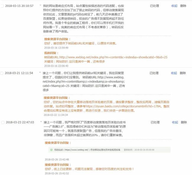 遇到这个问题的不是我一个人,明明是响应式网站,站点属性选的“自适应”(代码适配也试过了),可百度就是给你转码了,在收录网页里面加广告就不说了,把我文章里js代码还有图片都转没了,严重影响用户体验,直接导致跳出率增高,排名上不去。有人说加禁止转码的代码啊,对不起,没用的,我加的还是百度官方文档里提供的代码(不是官方的我也试过了)。