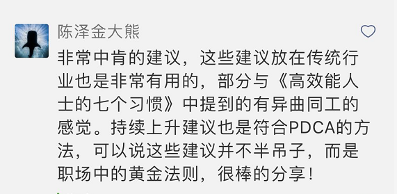分享内容经过整理在个人公众号发出后有幸获得了很多业内朋友的支持,收到大量行业新人老人的反馈觉得对各个阶段工作瓶颈期突破的帮助很大,举些例子: