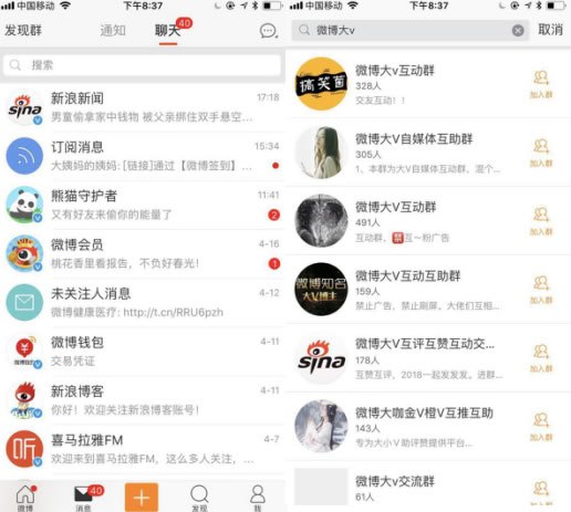 可能有些人对微博不熟悉哈,我这边给她讲一下如何去发现群。发现群在消息这个板块。版块的话左上角有个发现群,然后搜索相关的关键词。大家也可以去建个群,这边我也给大家去设计一下关于微博群的一个排名。微博群其实跟那个qq群排名也差不多一个性质,也是设置关于你产品功能相关的一些关键词。因为这些关键词的话,决定了一个搜索量。