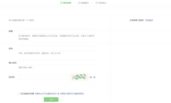 填写小程序账号信息,包括邮箱、密码等: