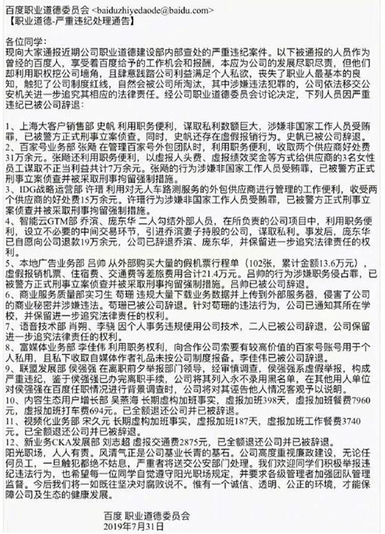 前期,百度通报了北部12名员工严重违纪案件,通报通告称,被通报人员作为曾经的百度人,利用职权挖公司墙角,肆意践踏公司利益满足个人私欲,触犯了公司制度红线。其中14人被辞退,部分人员涉嫌违法犯罪,公司依法移交公安机关进一步追究其相应的法律责任。