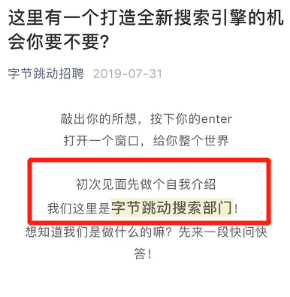 7月31日,今日头条、抖音母公司字节跳动旗下微信公众号“字节跳动招聘”发布招聘消息《这里有一个打造全新搜索引擎的机会你要不要?》,宣布字节跳动搜索部门已然成立。