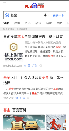 而百度则直接跳出2条广告。不过还加了一句风险防范用语:投资有风险,选择需谨慎。