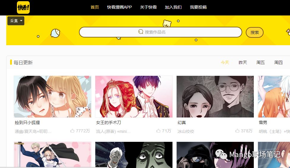 1.我先下了一个APP,看了看它的内容制作方向。从他的内容制作我们可以看到有情感类的安抚和宣泄,比如职场的困惑,生活的不如意,心情的调节,类似于一种漫画式的心灵鸡汤吧(相比于文字类的心灵鸡汤,漫画式的更富有活力,人们更喜爱看,这也是它能成功的一方面?),又有很多的网络小说改编似的内容,偏向于校园中传播的玄幻啦,爱情啦等等。当然内容也不仅限于此,但对我分析他的用户人群来说这些已经足够了。