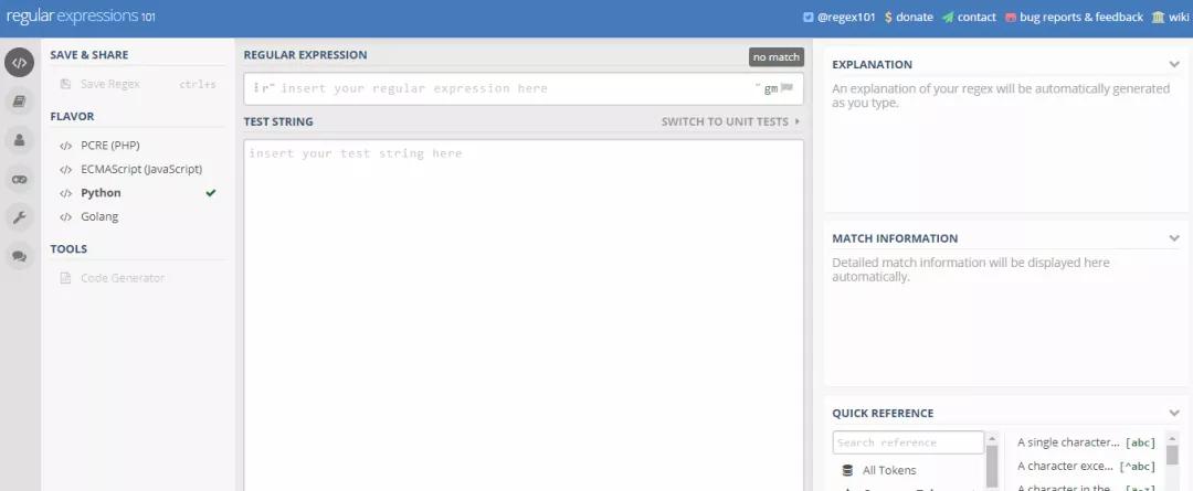 强大的正则表达式工具,你可以实时查看匹配信息,并且会用不同的颜色将 Group 标记出来。而且有 Quick Reference 来帮助你记忆正则表达式的规则和 Explanation 对你的正则表达式进行解释。重要的是,支持直接生成多种语言的代码。