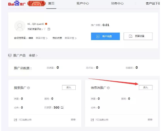 百度的竞价推广和信息流推广是在一个平台上,我们登入账号后,即可点击进入后台。