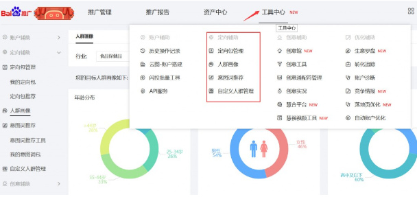 ▲ 定向包推荐:在后台定向包推荐中选择系统推荐的定向包、检索相关业务词、选择相应人群
