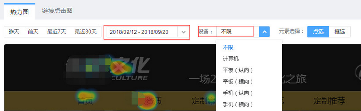 在百度统计后台有一个页面点击图,是以热力图的形式展现,同时还可实现对时间、设备的筛选。
