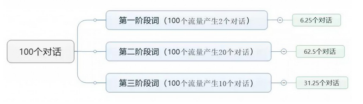 假设第一阶段的词100个流量可产生2个对话,第二阶段的词可产生20个对话,第三阶段的词只有10个。