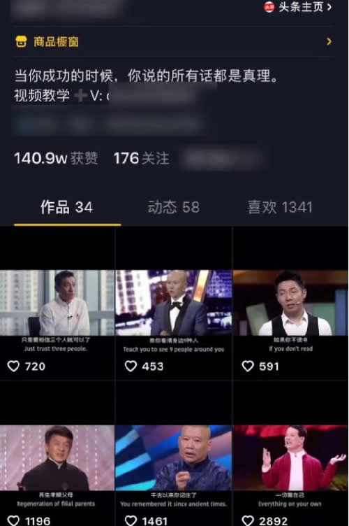 大家可以看这张图,人家通过抖音每天发励志正能量作品,前期把抖音粉丝养上去,中后期通过教别人制作视频来变现。
