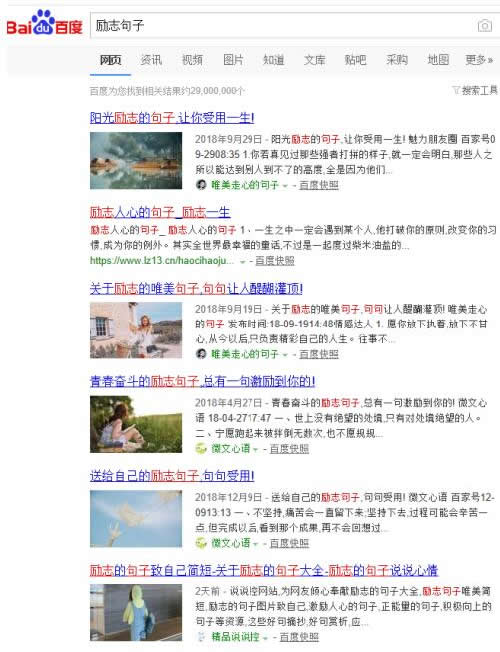 同样去百度搜索:励志或励志句子,可以找到一大堆的文字材料,这些文字足够去完成视频配音的操作。