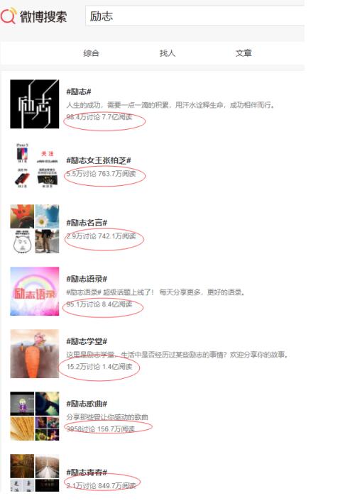同样,在微博热搜里,搜索:励志,讨论人数高达98.4万,总流量7.7亿,能看懂这张图的人知道这意味着什么。