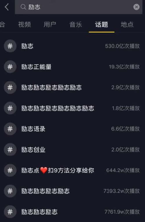 先给大家看一张图,在抖音通过搜“励志”话题的结果,笔者通过分析,在抖音上关注励志话题的人真的很多,就励志就达到了530亿次播放量,这是抖音平台所有发励志作品的总数据,一看数据就知道这背后市场有多大,就卖励志类的书,也可以挣不少的钱。