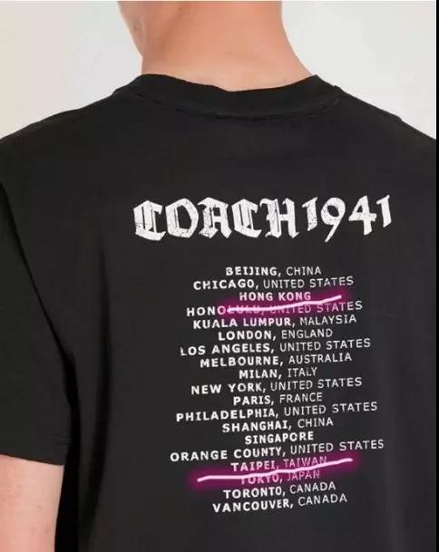 据了解,coach的这款T恤为Coach与迪士尼联合款,在T恤背面印有多个城市+国家名称,其中北京和上海后面都跟有中国,然而中国香港和中国澳门则独立一个板块,并未在其后面加上国家名称。