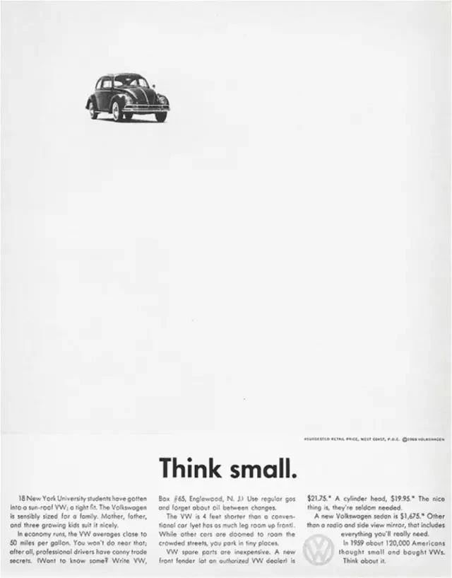 还有甲壳虫经典的《think small》文案,也是将车子“小”的优点,进行了非常具体的说明,让不懂汽车的人,也可以非常轻松的读懂文案信息。