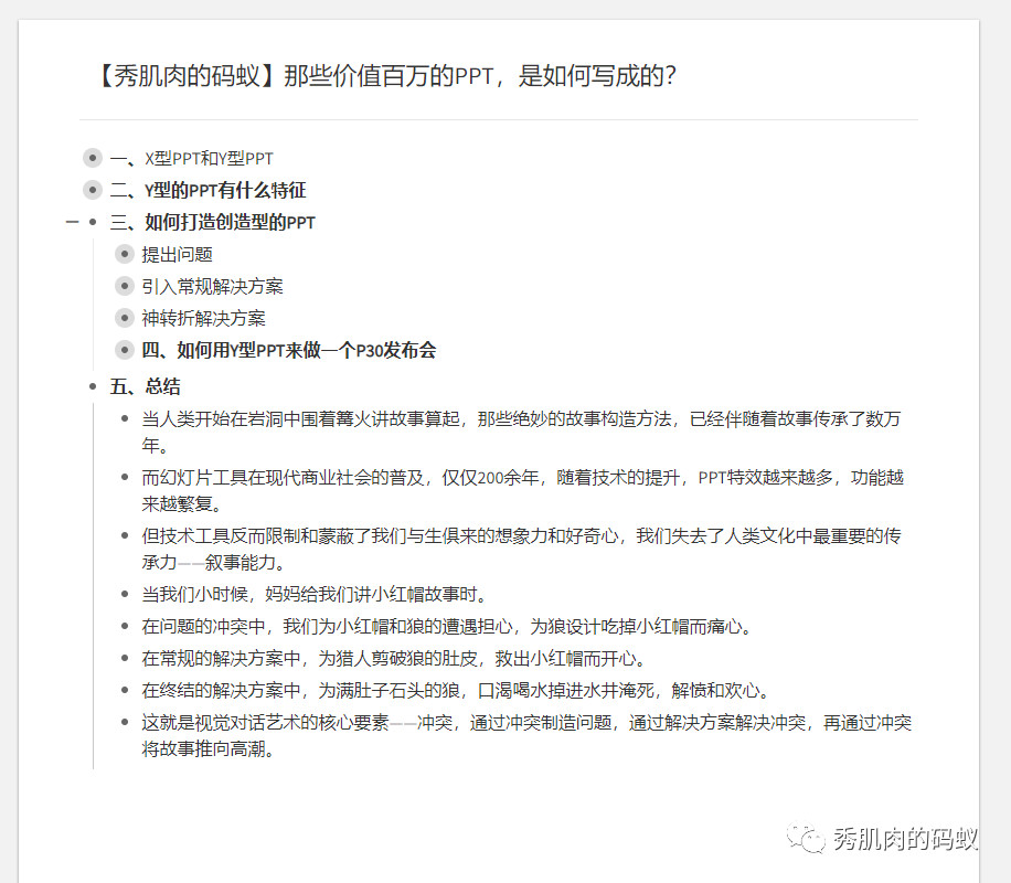 这是我在用幕布写《那些价值百万的PPT,是如何写成的?》时的文稿,通过搭建文章框架,再逐个丰富里面的内容。