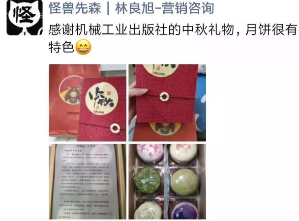 前段时间中秋时,一个出版社给我送了一盒月饼,我拆开看了竟然还有紫色和其他不同颜色的月饼。看到这些也是超出我的预期,再加上其他贴心的设计,让我忍不住发了一个朋友圈。