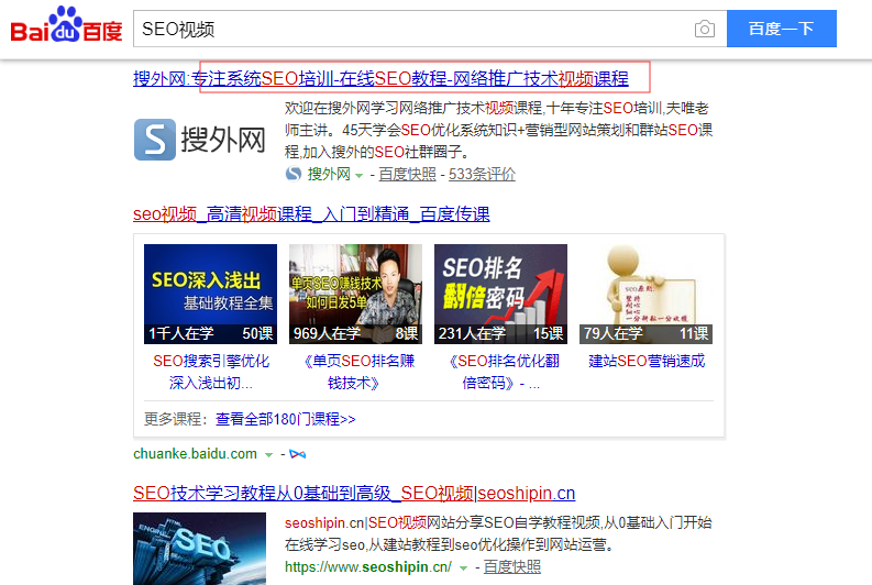 这个应该是很多SEO最熟悉的一种匹配方式了,什么是完全匹配呢?比如说我的关键词是“SEO视频”,如果网站中完整的出现了这个词,并且关键词的位置也匹配,这样就是完全匹配。这里需要特别明确说的一点就是,完全匹配一定是一个单独的关键词才是,什么是单独的关键词呢?我们看下搜索SEO视频出来的网站匹配度: