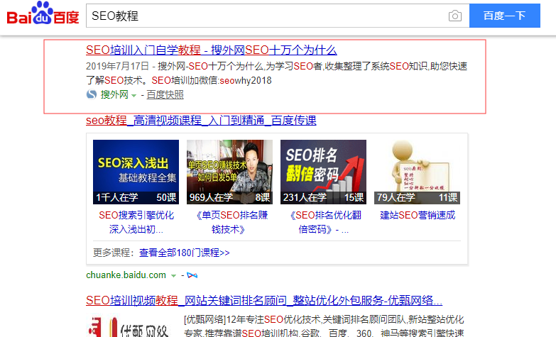 上图中我标出来的网站就是一个典型的分词匹配标题,对百度来说,“SEO”和“教程”都是2个独立可以作为关键词的词组,当用户搜索“SEO教程”的时候,搜索引擎根据大数据原理,可以很容易的认为这2个关键词具有匹配性质,所以在内部就讲这2个词联系了起来,形成了分词匹配,分词匹配的特点就是2个词并不是连接在一起的,在2个词中间是有别的词隔开的,但是这并不影响网站的排名,从“SEO教程”这个词排名在前面的网站我们都可以看得出来。