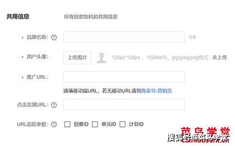 出价完成后,就是开始填写创意物料了。共用信息它相当于是底部创意物料的共用信息。品牌名称,指自身产品或品牌的信息;用户头像、推广URL根据自身情况进行填充即可。