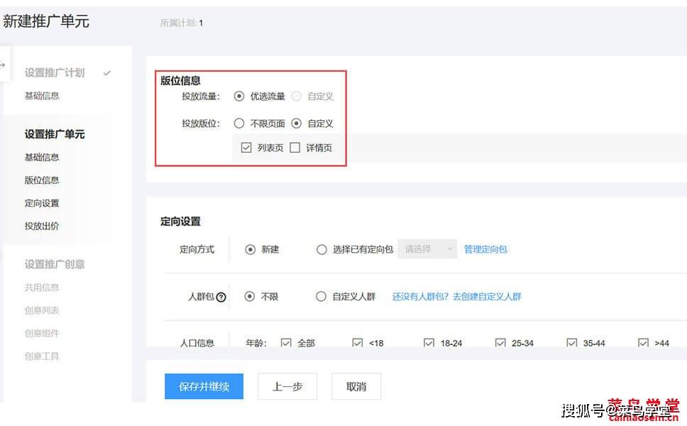 计划名称一般以“信息流投放平台-产品-用户人群”来区分,比如是手百还是贴吧。推广对象的选择如果你是网站落地页就选网站链接,如果是APP下载就选APP下载。推广计划预算可以根据预定预算上浮20%设定。推广日期和推广时段的设置很好理解,就选择你需要投放的时间就好了。最后一个预算分配控制,一般新建账户菜鸟菌建议选择匀速。 接下来保存进入下一步,新建推广单元,命名一般为“定向方式(兴趣+关键词)-展现样式(单图、大图、三图)”。接下来就是版位信息和定向设置,投放流量一般如果你是OCPC出价,那优选流量即可;如果你是CPC出价,建议自定义,将浏览器和贴吧分开出价。投放版位前期预算不多的话,菜鸟菌建议选择列表页。