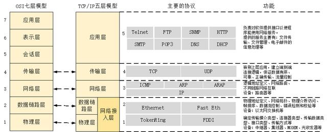 OSI七层模型和TCP/IP五层模型的对比如下,我们现在用的是五层协议模型: