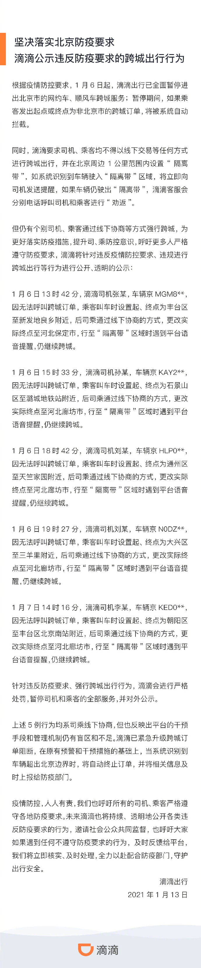 14 日消息 滴滴出行官方微博于 1 月 13 日晚间公示了违反防疫要求的跨城出行行为,5 例行为均系司乘线下协商,但也反映出平台的干预手段和管理机制仍有盲区和不足。
