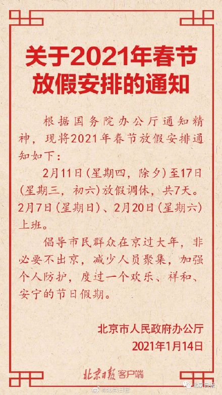 今天,北京市人民政府办公厅正式发布关于2021年春节放假安排的通知