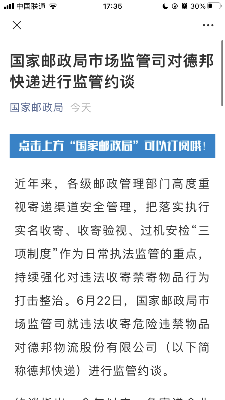 国家邮政局市场监管司表示,近年来,各级邮政管理部门高度重视寄递渠道安全管理,把落实执行实名收寄、收寄验视、过机安检“三项制度”作为日常执法监管的重点,持续强化对违法收寄禁寄物品行为打击整治。6 月 22 日,国家邮政局市场监管司就违法收寄危险违禁物品对德邦物流股份有限公司(以下简称德邦快递)进行监管约谈。