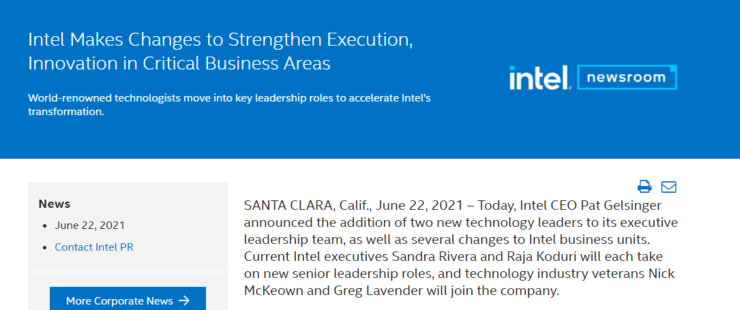 Rivera、McKeown、Lavender 和 Koduri 都将直接向 Pat Gelsinger 汇报。