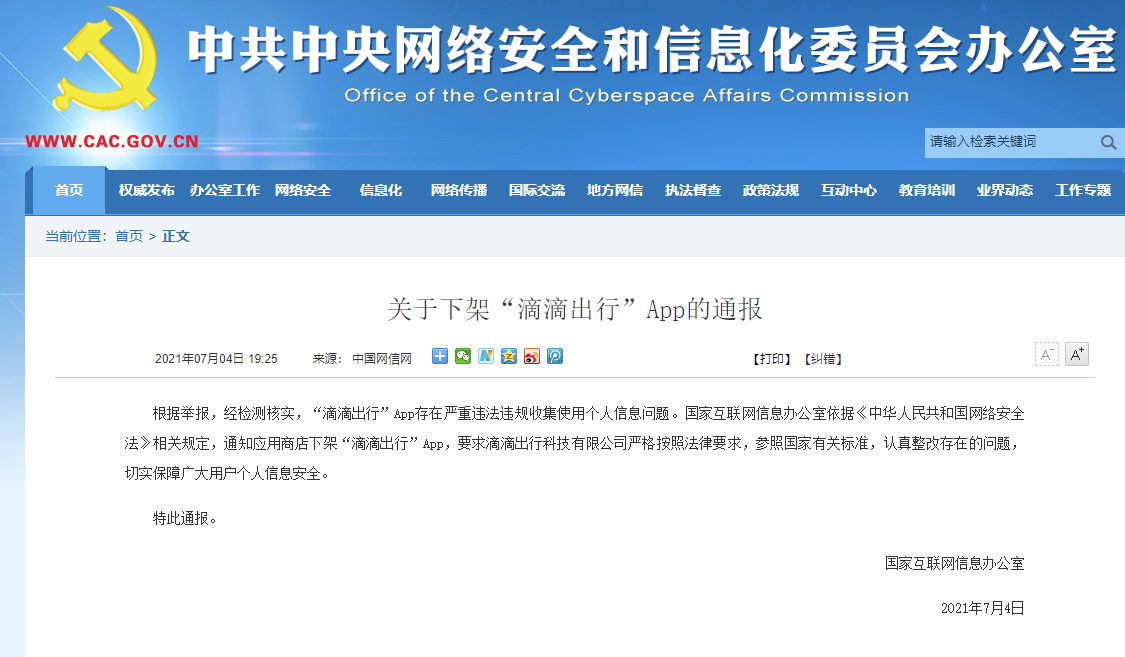 国家互联网信息办公室依据《中华人民共和国网络安全法》相关规定,通知应用商店下架“滴滴出行”App,要求滴滴出行科技有限公司严格按照法律要求,参照国家有关标准,认真整改存在的问题,切实保障广大用户个人信息安全。