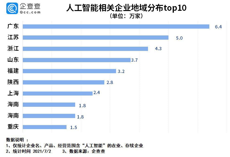 从省份分布来看,目前我国现存的人工智能相关企业主要分布在广东、江苏、浙江等省份。其中广东拥有最多的人工智能相关企业,共 6.4 万家排全国第一。江苏排名第二,共 5.0 万家相关企业。浙江排名第三,有 4.3 万家相关企业。