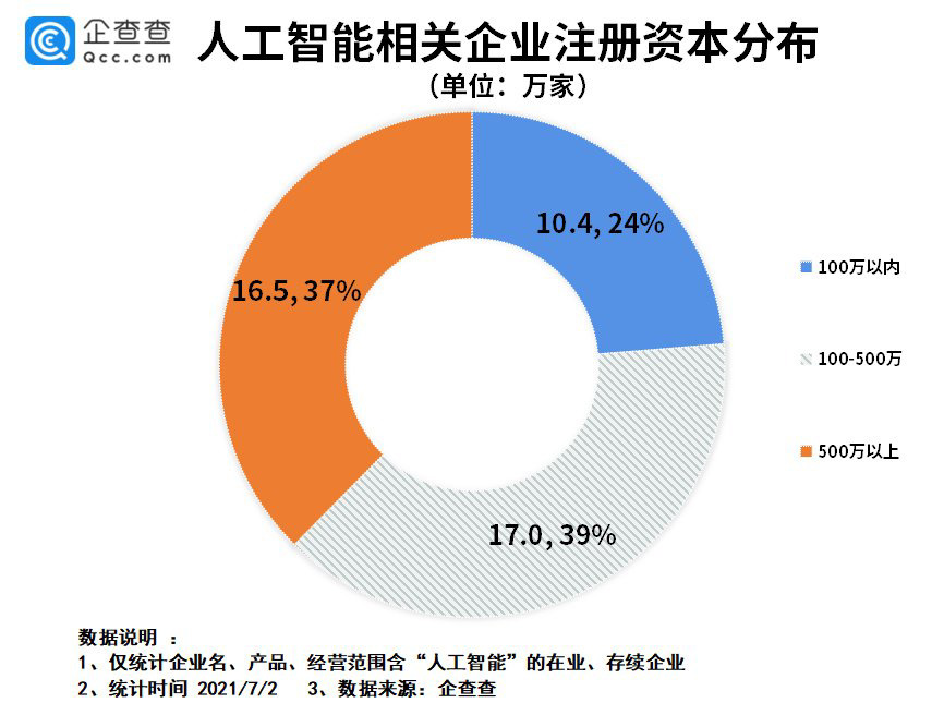 从注册资本来看,人工智能相关企业注册资本在 100 万元以内的企业数量占 24%,注册资本在 100-500 万元和 500 万元以上的分别占 39% 和 37%。