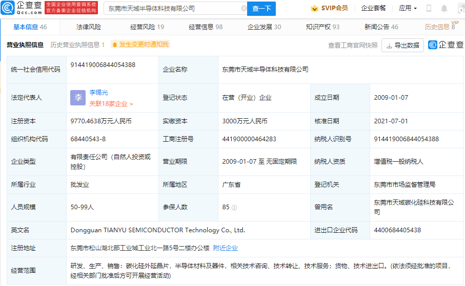 企查查信息显示,该公司成立于 2009 年,法定代表人为李锡光,经营范围包含:研发、生产、销售:碳化硅外延晶片,半导体材料及器件等。