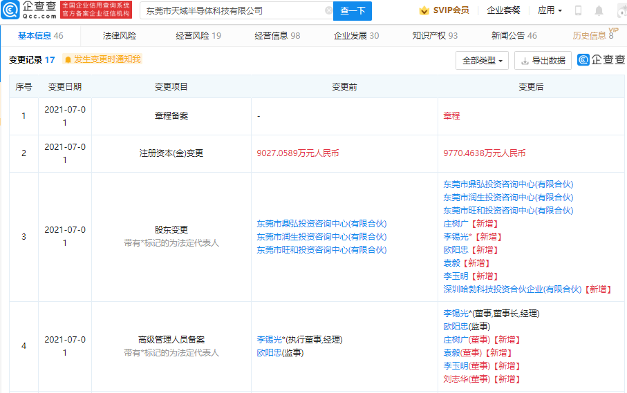 东莞市天域半导体科技有限公司发生工商变更,新增股东华为关联公司深圳哈勃科技投资合伙企业 (有限合伙),同时公司注册资本由约 9027 万元人民币增至约 9770 万元人民币,增幅超 8%。