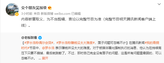不过对于罗永浩称“赚钱没多大难度”这一说法,交个朋友科技公关负责人吴加录在微博回应称:内容断章取义,为不当剪辑,言论以完整节目为准(完整节目明天腾讯新闻客户端上线)。你又是怎么看的呢?