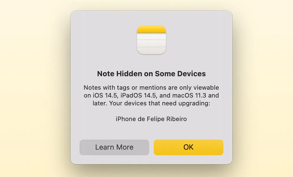 如果备忘录应用检测到用户的 iCloud 账户有一台设备运行版本低于 iOS 14.5 或 macOS Big Sur 11.3,便会发出提醒称相关笔记将在这些设备上不可用。值得一提的是,最新版本的 iOS 14 和 macOS Big Sur 部分兼容这些功能。