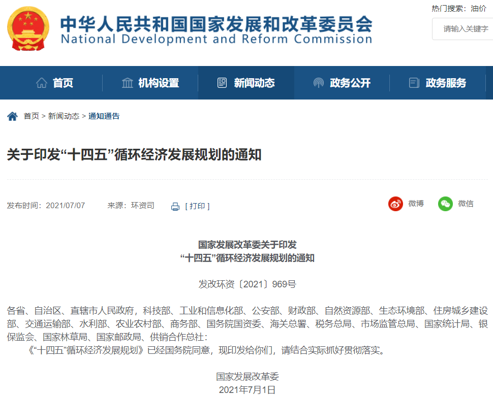 7 日消息 今日,国家发展改革委等多部门印发“十四五”循环经济发展规划的通知。