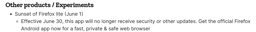 近日,Mozilla 在官网宣布,Firefox Lite 已在 6 月 30 日停止开发和支持,将不再进行安全更新和其他更新,官方建议用户使用 Firefox Android 版本。