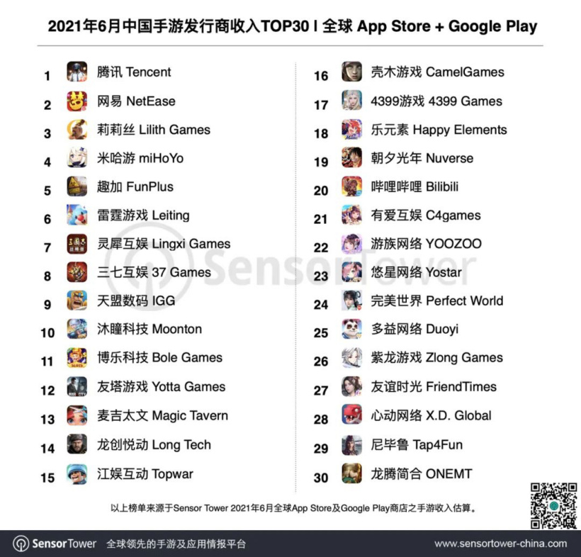 8 日消息 Sensor Tower 近日公布了 2021 年 6 月中国手游发行商全球收入排行榜,中国有 36 个发行商入围前 100 名,共吸金 22.4 亿美元,占全球总额的 38%。