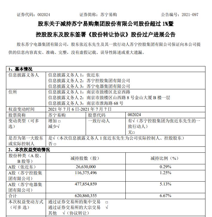 今日晚间,苏宁易购发布公告称,7月6日-7月7日,张近东、苏宁控股集团有限公司、苏宁电器集团有限公司,通过大宗交易、协议转让方式合计减持公司6.67%股份;张近东及其一致行动人合计持股比例降至32.03%。
