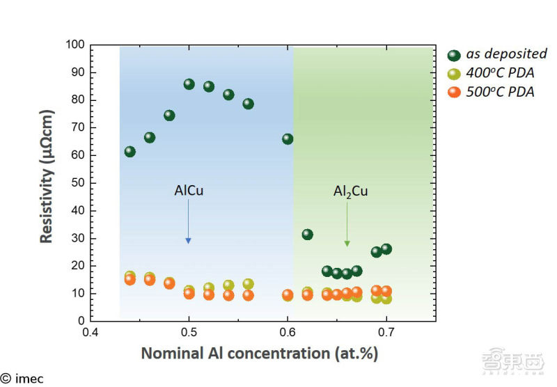 IMEC 展示了基于铝的二元化合物的实验研究,重点是它们的电阻率,理想配比状态的 AlCu 和 Al2Cu 薄膜,电阻率低至 9.5μΩ*cm。